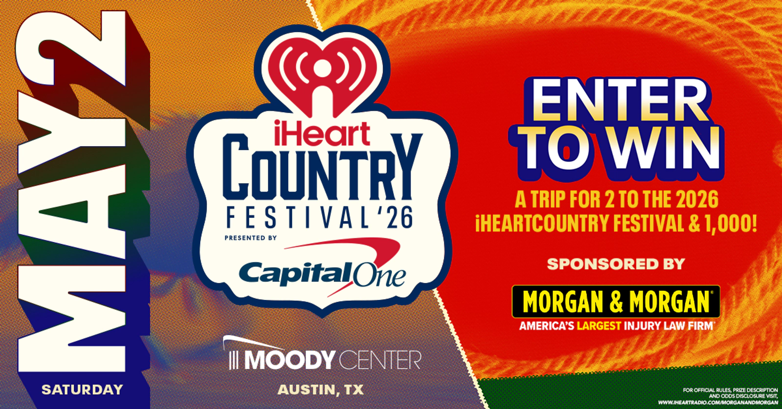 WIN A TRIP FOR 2 TO THE 2026 iHEARTCOUNTRY FESTIVAL & $1,000! SPONSORED BY MORGAN & MORGAN